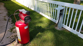 Steve also brought out the big guns. (His tools to work on the project.) He knew that all of the bolts and nuts would be rusted tight, so he brought out his torch and tanks to cut them off. He also brought out his air compressor to run his air tools. Since he installed a power post pedestal in our yard, just like at the campgrounds. He is able to plug in his tools while working on the motorhome or anything else in the yard. Handy dandy!