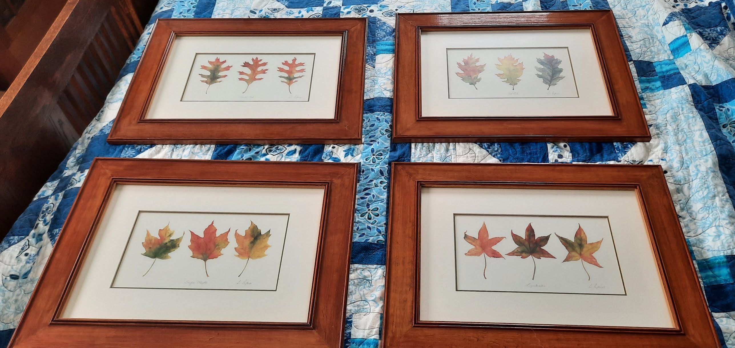 They're absolute favorites of mine. I got them from a lady when we went to her home to buy some lamps. She was ready to move and didn't know what to do with all of the extra artwork that she had to move. Some of it she did not want to package up for shipping across the country. She gave me a very nice price to take them off her hands. They're some of my favorite colors and of course my favorite fall season. We weren't sure exactly where to put them or how to arrange them so I made up blank pieces of paper the exact size by taping some together. Then we taped them to the wall in various arrangements in places around the house. We don't have a lot of wall space. We decided to put them back in the bedroom where they had been previously. But in a new space on a new wall.