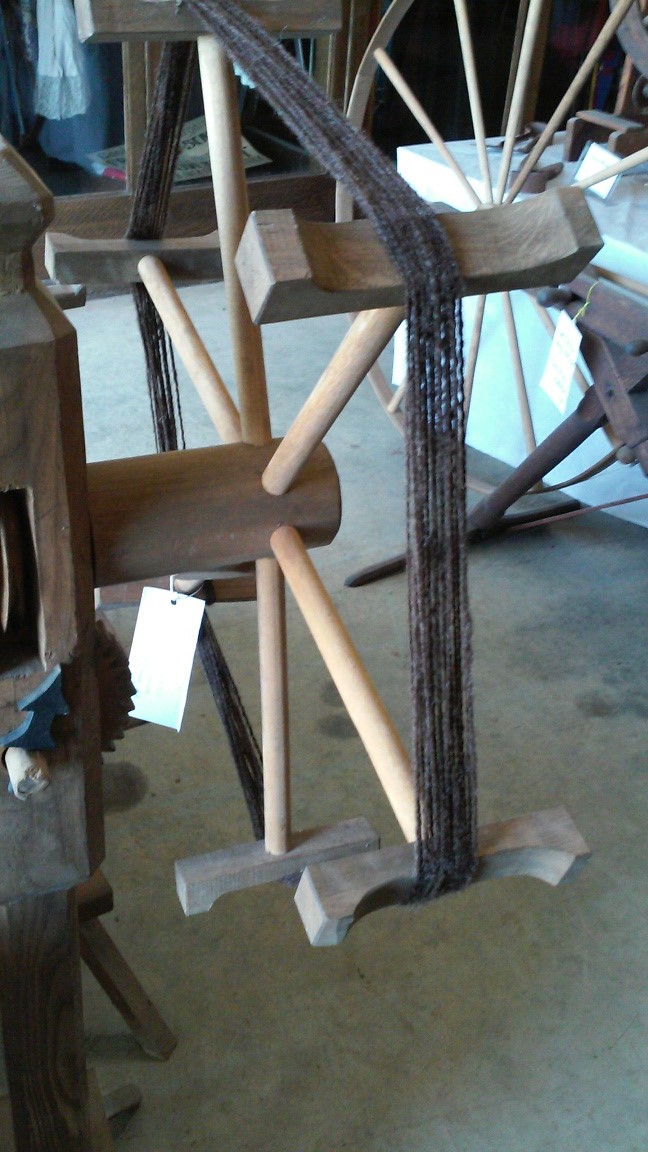 We seem to have a plethora of "yarn winders" which are used to wind on the newly spun and plied yarns, to be able to make them into the long loop type old fashioned skeins.  Now they can be dipped into sudsy water to wash the natural lanolin off the wool, or dipped into dye vats for color.