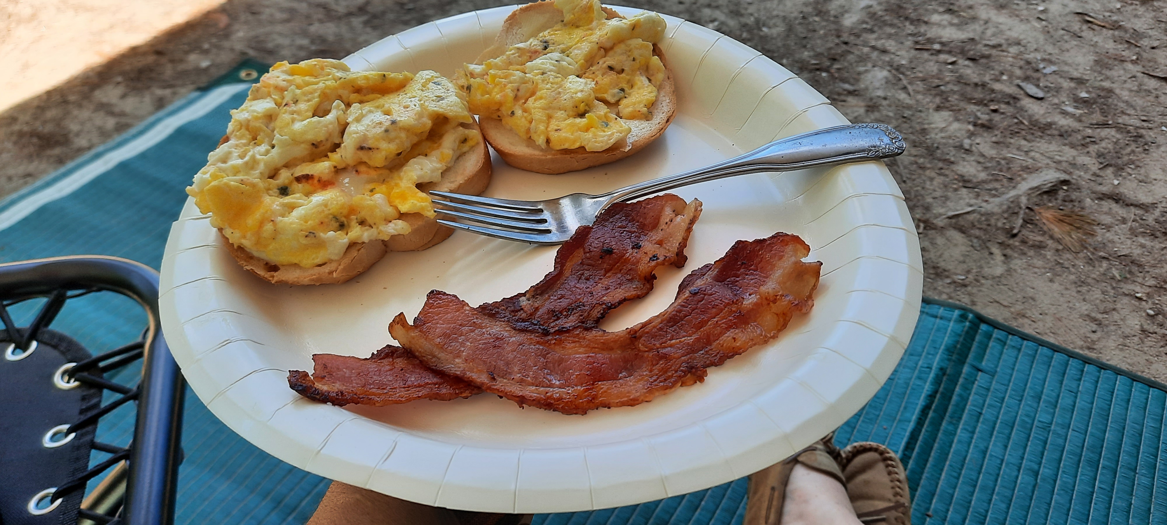 Because neither of us really felt like having breakfast this morning, we decided to cook up breakfast for lunch once we were settled into our campsite. We do have to start using up our eggs as well as our fresh produce before we cross the border into Canada.